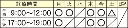 ※初診の受付は11時まで。再診の受付は11時30分まで △午後診をご希望の場合は代表までご連絡ください。
